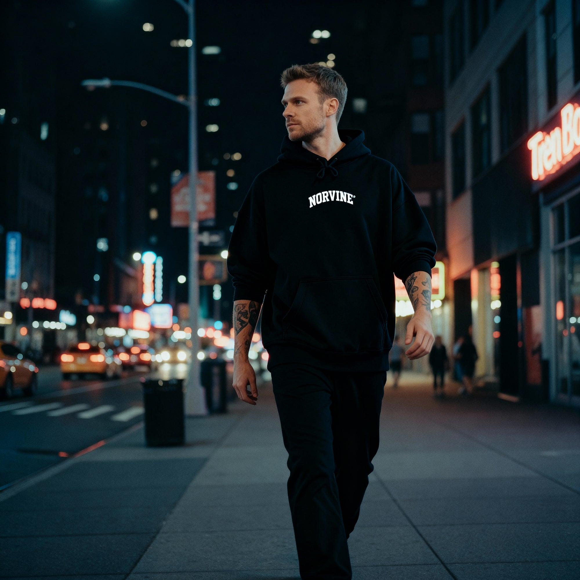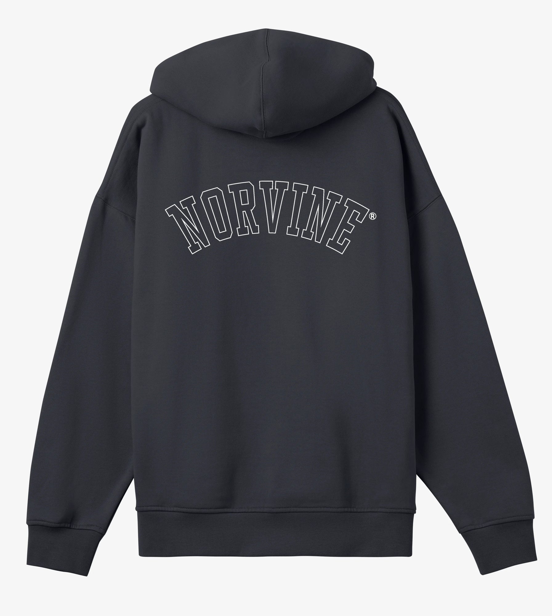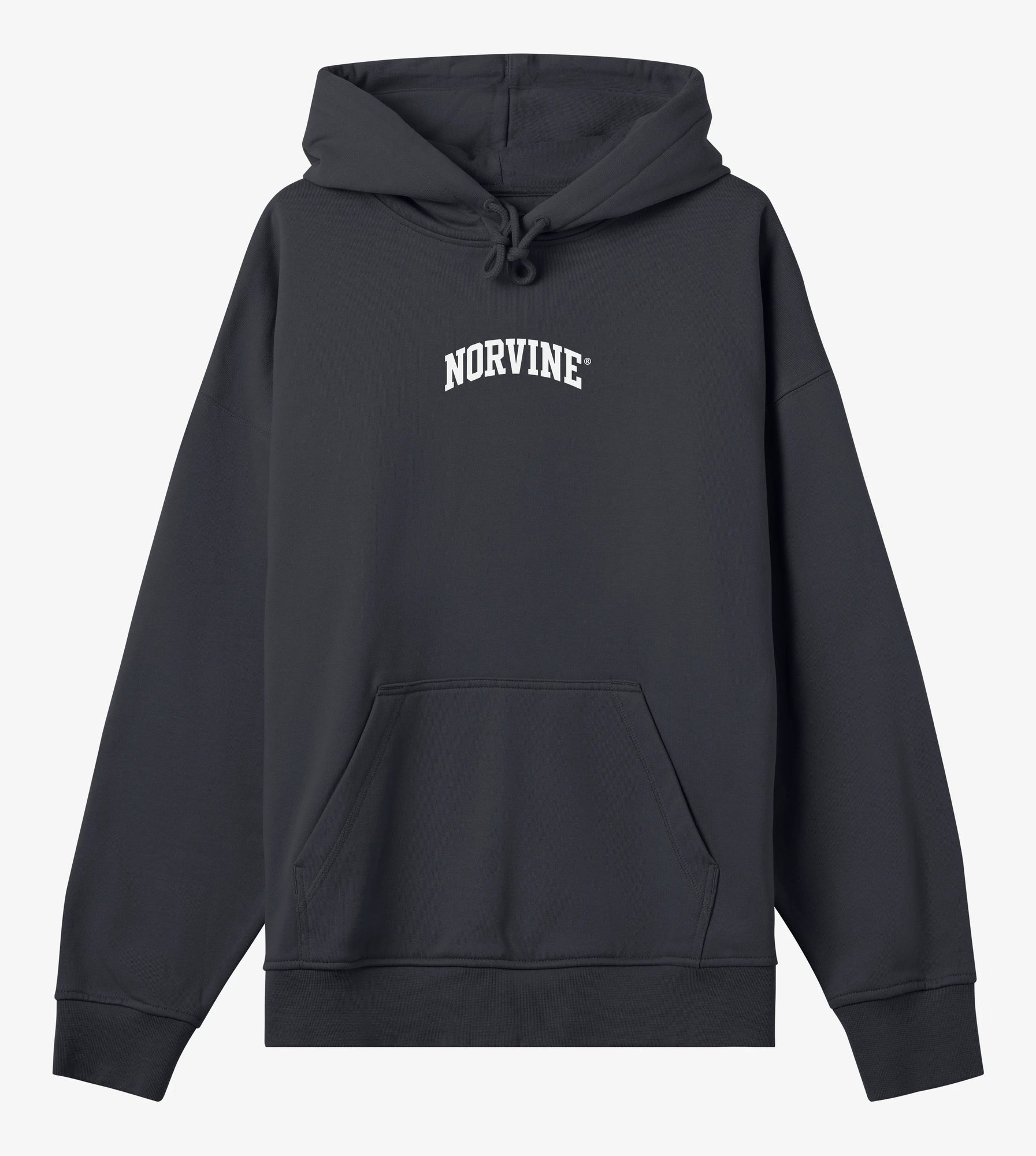 Norvine men’s boxy hoodie. Made from heavy brushed fleece (370 gsm) of 83% organic cotton and 17% recycled polyester. Oversized cut with dropped shoulders, wide ribbing, felled shoulder seams with neck tape, twin needle stitching, and double-layer hood with drawstrings. Finished with flatlock seam kangaroo pocket and inside neck half moon detail.